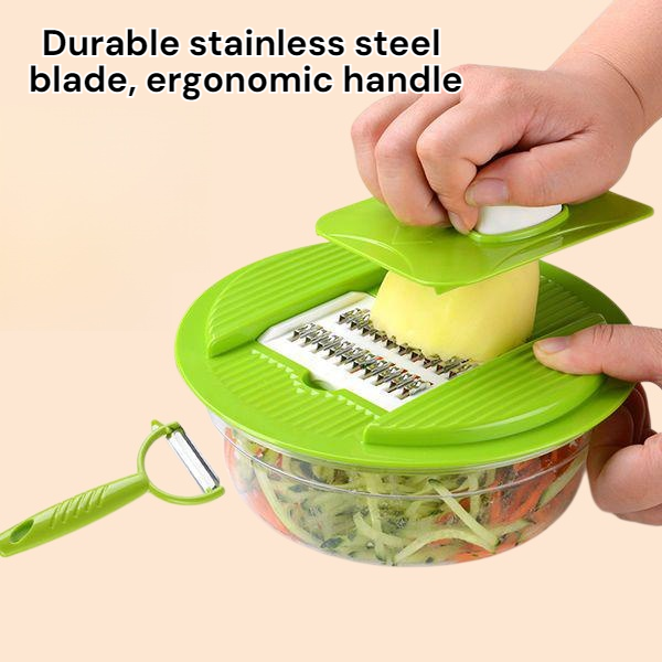 Multi-functional grater and slicer for efficient food preparation. Durable stainless steel blades, ergonomic handle, easy to clean, suitable for vegetables, cheese, and fruits.